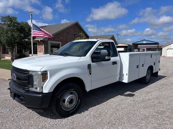 2019 FORD F350 REGULAR CAB DUALLY IN 12FT BED, 6.2L GAS AND RWD, POWER WINDOWS AND LOCKS, CRUISE, BLUETOOTH, BACK UP CAMERA, AUX SWITCHES, TRAILER BRAKE CONTROL, AMERICAN EAGLE TOOL TRTAY, AND A KNAPHEIDE SERVICE BED, RUNS GREAT , TIRES ARE 90% AND HAS 130K MILES