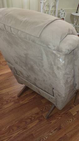 La-Z-Boy recliner rocker in excellent condition, very clean, seldom used. Beige, felt-type material. Opens into sleep position and further leg-rest upward extension.