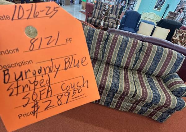 No pushy sales people so come look at your leasure. Nice sofa couch that is burgundy blue stripped. Price is $289.50 plus sales tax. Can be seen and purchased in furniture area at Mike’s Unique Flea...