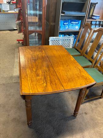 In nice, sturdy condition. Should have had a leaf center piece but it was missing. Some finish wear but no major issues. The table has vintage rollers on the legs as well. With the leafs down the table measures 30.5”x42.5”x30.5”t. With the leafs up the length is 57.5”. The chairs measure 17.25”w x 19”d x 41”t with a seat height of 18”. Pick up is on Battlefield rd just west of Scenic Ave at Battlefield Nu-2-U Gallery. All purchases are subject to sales tax.
