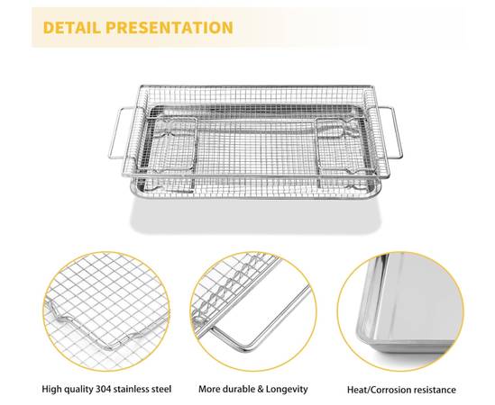 DIMENSIONS & MATERIAL】 1 Set 304 stainless steel samsung stove oven air fryer basket and tray, including 1 pcs 20.4’’L x 13.4’’W samsung air fryer basket, 1 pcs 18.8’’L x 13.4’’W samsung air fryer tray (drip pan), 1 pcs 24 3/4" x 16 1/2" high quality 304 stainless steel samsung stove oven rack.
