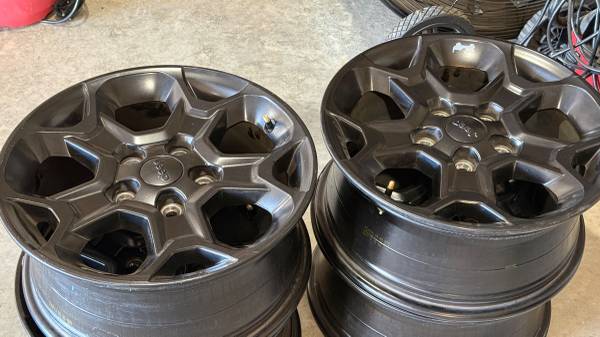I have for sale Four (4) black aluminum wheels removed from a 2023 Jeep Gladiator. The wheels are 17 inch X 7.5 inch with a 5x127 (or 5x5) bolt pattern. All four wheels are in excellent condition and come with the lug nuts. There are no tire pressure monitoring sensors. There are many vehicles these wheels will fit and a google search should help you identify which ones they are. I am asking $200.00 for all four. Any reasonable offer will be considered. Should you be interested you can contact me at show contact info