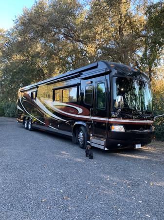 45ft, Approx 51,000 miles, new tires, alarm system w/cameras, Bose stereo surround system, 4 tv’s, central heat & air, fireplace, bath & half, full size shower, leather upholstery, granite tile & floors, corian counters tops, gas stove, full size refrigerator, dishwasher, washer/dryer, safe, 12.5 generator, Aqua hot water, all new house batteries and much more.