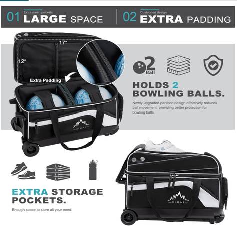 The GoHimal Double Roller 2 Ball Bowling Bag is designed to accommodate two bowling balls and features a separate shoe compartment capable of fitting up to US Men's Size 15 shoes.